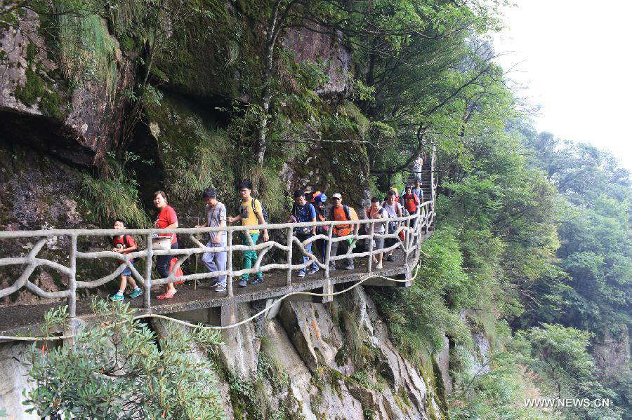 Travellers go hiking during the 7th Camping Festival of Mountain Wugong in Pingxiang, east China's Jiangxi Province, Sept. 13, 2014. The two-day camping from Sept. 13 to 14 attracted thousands of travellers all around the nation. (Xinhua/Zhang Hui) |