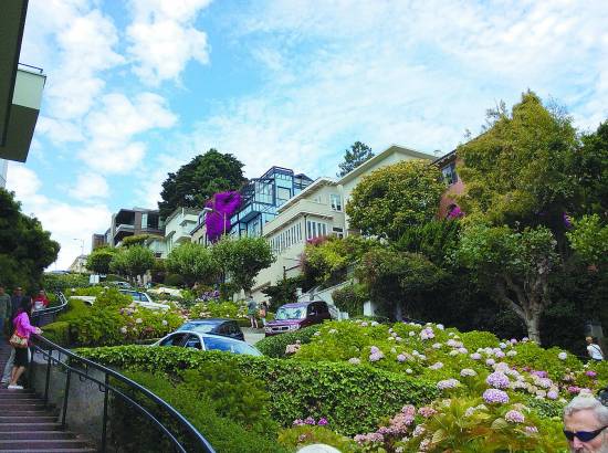 Lombard Street, with eight sharp turns, is said to be the most crooked street in the world, designed to slow traffic around the winding section of Lombard Street. 'It is so impressive, I think. Beijing should build some road like this. That would help the city solve the problems of traffic jams.' Wang Longting is a primary school student who visited the United States this summer. (Photo/ China Youth Daily) |