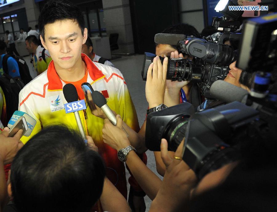 Chinese swimming athlete Sun Yang receives an interview at the international airport in Incheon, South Korea, Sept. 16, 2014. Some members of the Chinese Sports Delegation arrived in Incheon on Tuesday afternoon to attend the 17th Asian Games. (Xinhua/Gong Lei)