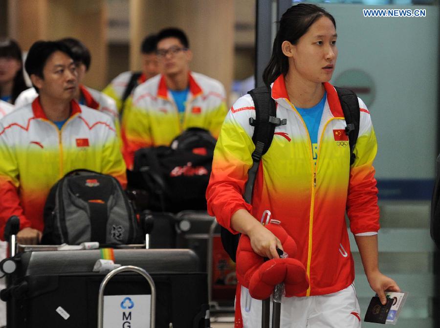 Chinese swimming athlete Liu Zige (1st R) walks out of the international airport in Incheon, South Korea, Sept. 16, 2014. Some members of the Chinese Sports Delegation arrived in Incheon on Tuesday afternoon to attend the 17th Asian Games. (Xinhua/Gong Lei)