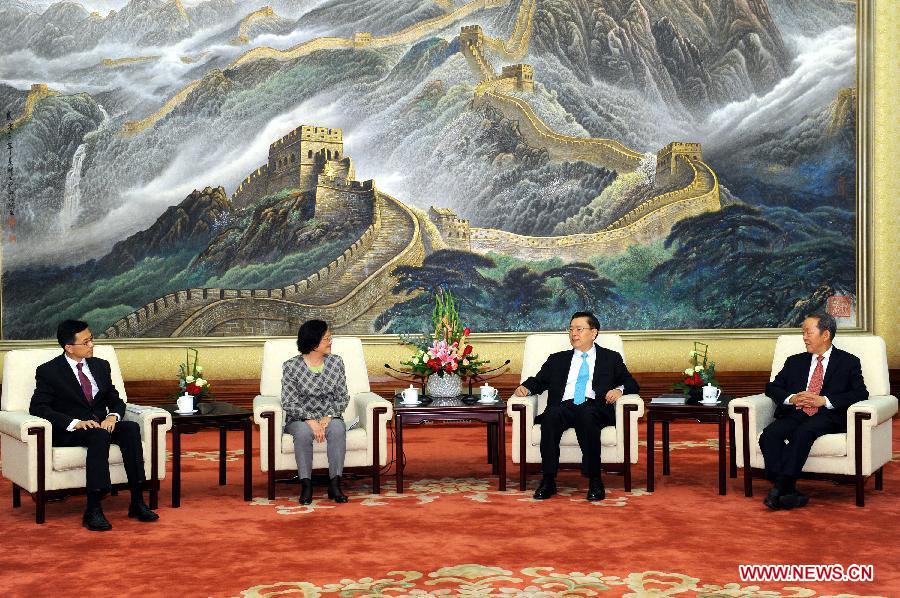Zhang Dejiang (2nd R), chairman of the Standing Committee of China's National People's Congress (NPC), meets with members of a visiting delegation of the Hong Kong Federation of Trade Unions headed by its president Lam Shuk-yee (2nd L). (Xinhua/Rao Aimin)