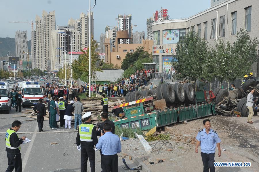 The police work at the traffic accident site in Zhanjiakou City, north China's Hebei province, Sept. 16, 2014. A runaway truck crashed into a bus stop in Zhangjiakou on Tuesday morning, with 14 casualties reported, local authorities said. (Xinhua)