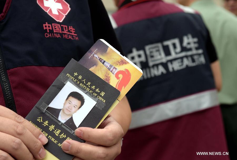 Qian Jun, head of a Chinese laboratory team, holds his passport before departing for Sierra Leone to help West African countries to contain the Ebola epidemic, in Beijing, capital of China, Sept. 16, 2014. The 59-member team, based at the Sierra Leone-China Friendship Hospital in the outskirts of the capital, Freetown, will carry out lab screening and observation to help Sierra Leone to improve lab testing. (Xinhua/Jin Liangkuai) |
