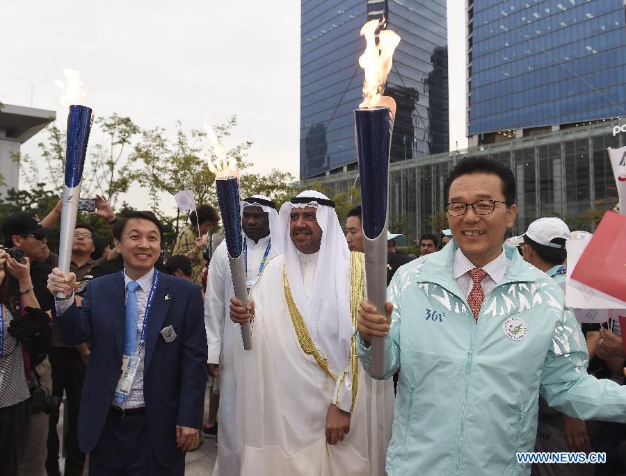 President of Olympic Council of Asia Ahmad Al-Fahad Al-Sabah (C), secretary-general of Incheon Asian Games Organizing Committee (IAGOC) Kwon Kyung-sang (R) and Yeonsu district chief Lee-Jaeho light a based torch during the Incheon Asian Games Torch Relay in Incheon, South Korea, Sept. 17, 2014. The 17th Asian Games will be held from Sept. 19 to Oct. 4. (Xinhua/Ye Pingfan) |