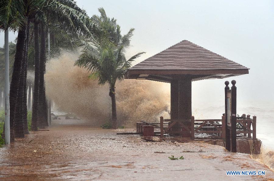 Huge waves are seen on the seashore in typhoon-hit Haikou City, capital of south China's Hainan Province, Sept. 16, 2014. Typhoon Kalmaegi made landfall on Hainan Island on Tuesday morning. (Xinhua/Guo Cheng)