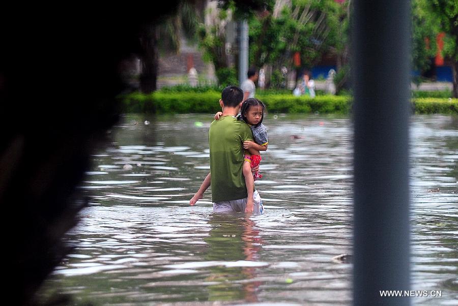 A man holding a young girl in arms walk on flooded road in typhoon-hit Haikou City, capital of south China's Hainan Province, Sept. 16, 2014. Seawater flew backward into the city as typhoon Kalmaegi landed in the island province on Tuesday morning. (Xinhua/Guo Cheng)