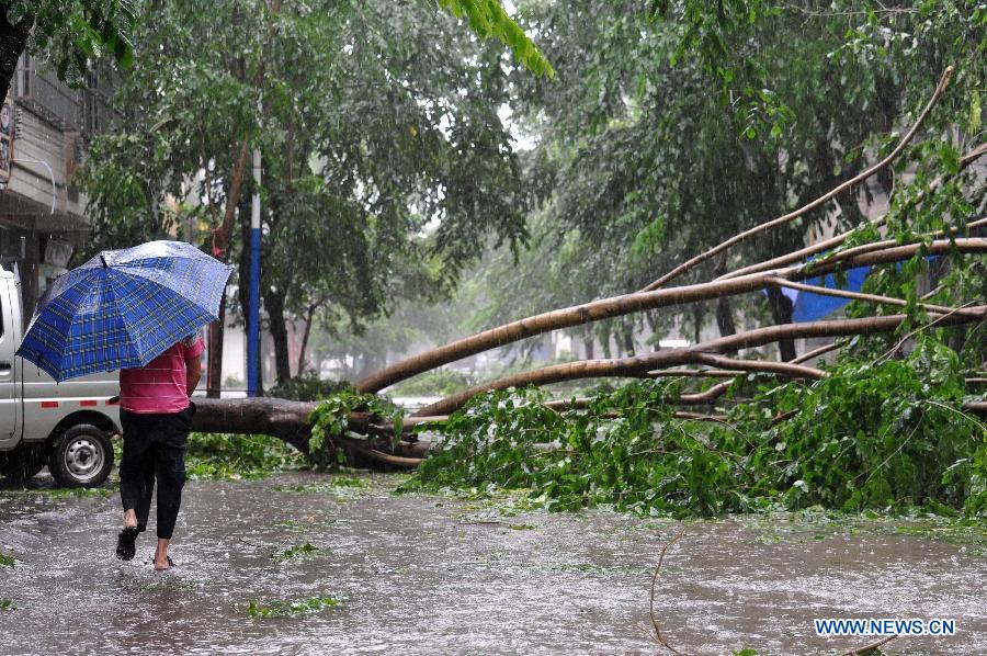 A man walks past broken branches in typhoon-hit Qionghai City, south China's Hainan Province, Sept. 16, 2014. Typhoon Kalmaegi landed in the island province on Tuesday morning. (Xinhua/Meng Zhongde)