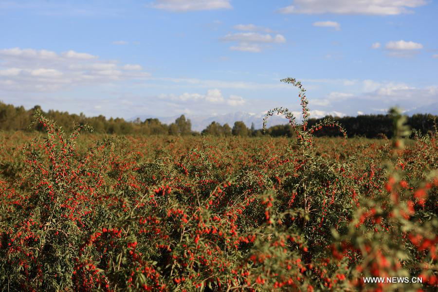 Farmers dry Chinese wolfberry in Dulan County of northwest China's Qinghai Province, Sept. 16, 2014. The output of Chinese woldberry in Dulan County reached 30,000 tons in 2014, with the production value of 900 million RMB yuan (145.8 million U.S. dollars). (Xinhua/Liu Dongjun)