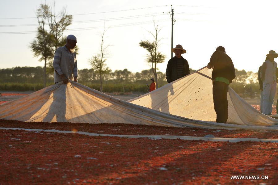 Farmers dry Chinese wolfberry in Dulan County of northwest China's Qinghai Province, Sept. 16, 2014. The output of Chinese woldberry in Dulan County reached 30,000 tons in 2014, with the production value of 900 million RMB yuan (145.8 million U.S. dollars). (Xinhua/Liu Dongjun) |