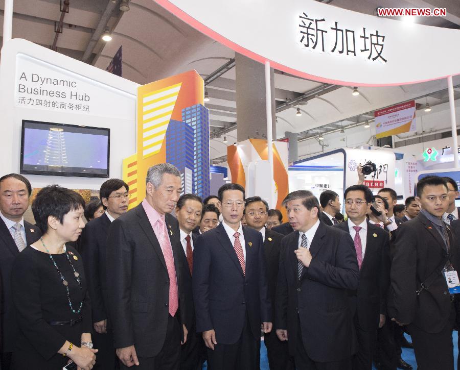 Chinese Vice Premier Zhang Gaoli (3rd L, front) and Singapore Prime Minister Lee Hsien Loong (2nd L, front) attend the launching of the Singapore section during the 11th China-ASEAN Expo, also the 11th China-ASEAN Business and Investment Summit, in Nanning, capital of south China's Guangxi Zhuang Autonomous Region, Sept. 16, 2014. (Xinhua/Wang Ye) |