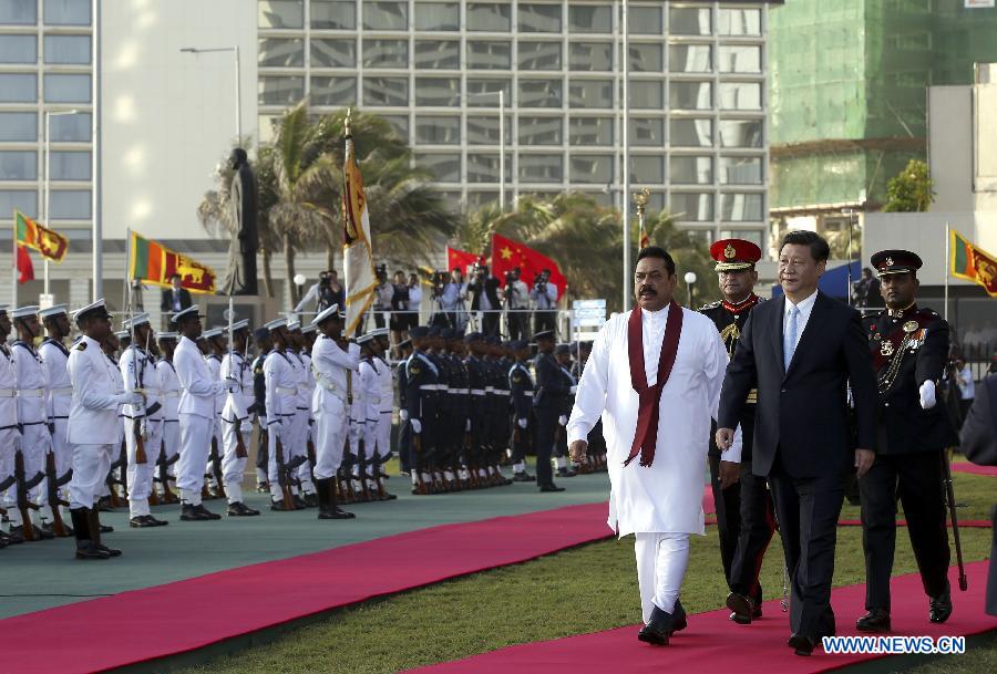 Sri Lankan President Mahinda Rajapaksa (L, front) holds a grand welcoming ceremony for Chinese President Xi Jinping (R, front) in Colombo, Sri Lanka, Sept. 16, 2014. (Xinhua/Ju Peng)