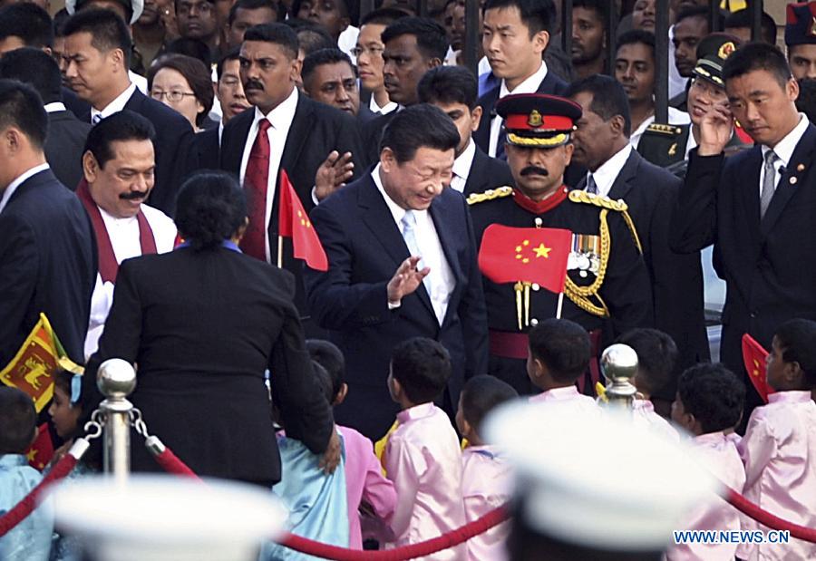 Sri Lankan President Mahinda Rajapaksa holds a grand welcoming ceremony for Chinese President Xi Jinping in Colombo, Sri Lanka, Sept. 16, 2014. (Xinhua/Li Tao)