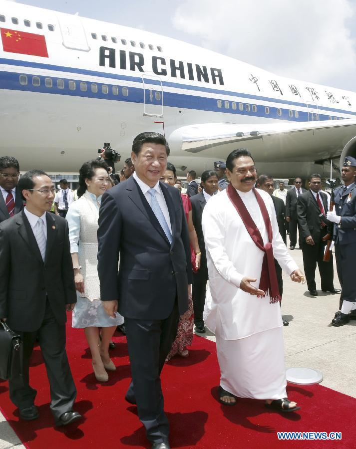 Chinese President Xi Jinping (L, front) and his wife Peng Liyuan (3rd L) are welcomed by Sri Lankan President Mahinda Rajapaksa (R, front) upon their arrival in Colombo, Sri Lanka, Sept. 16, 2014. Xi Jinping arrived here Tuesday for a state visit to Sri Lanka. (Xinhua/Ju Peng) |