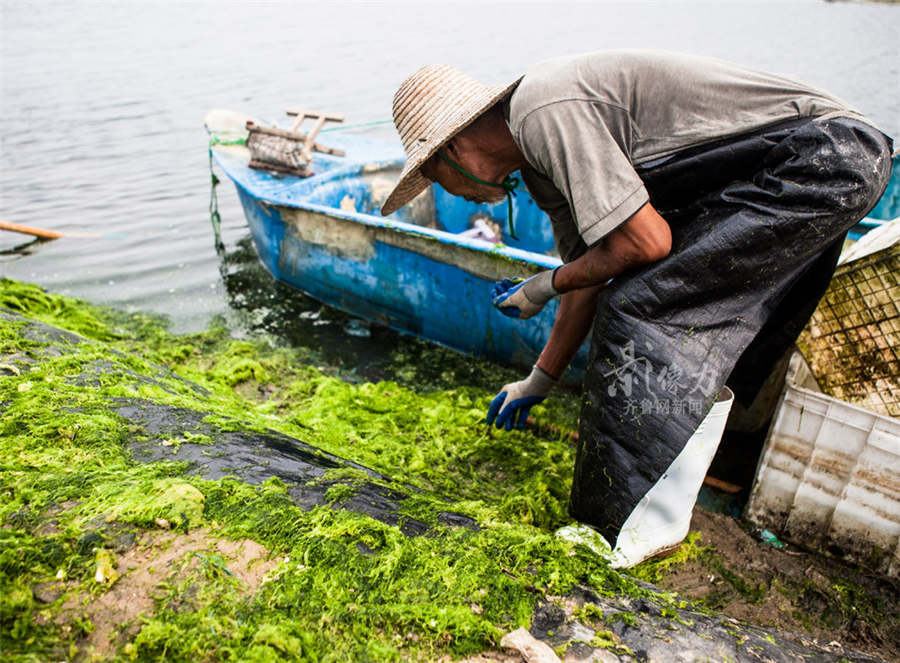 A worker picks up sea slugs beneath seaweeds. (www.iqilu.com/ Feng Xingcai)