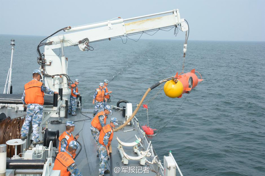 Photo taken on Sept. 15, 2014 show a minesweeper of South China Sea Fleet successfully detonating a smart mine in training. (Photo./81.cn)