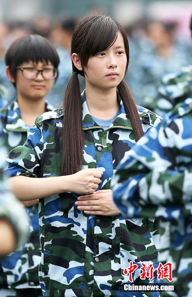 Female freshmen participate in military training in Nanjing. (CNS/Yang Bo)