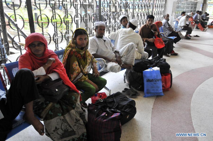 Passengers wait for buses at a bus station during countrywide 24-hour strike enforced by Bangladeshi Islamist party Jamaat-e-Islami who demand release of their party leader in Dhaka, Bangladesh, Sept. 18, 2014. Bangladesh's largest Islamist party Wednesday called countrywide strike from Thursday to Friday and Sunday to Monday protesting the apex court verdict that awarded one of its high-ranking leader for war crimes of life imprisonment. (Xinhua/Shariful Islam) |