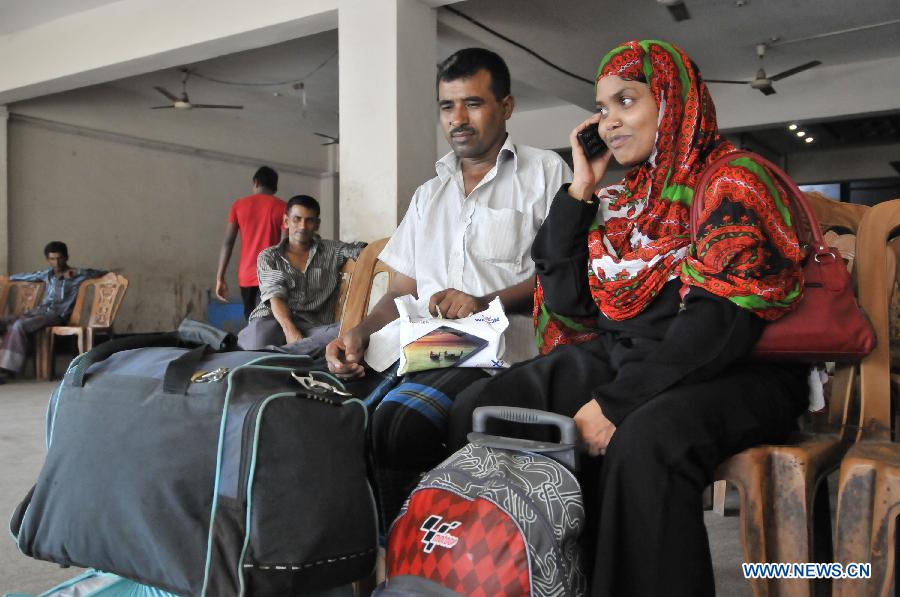Passengers wait for buses at a bus station during countrywide 24-hour strike enforced by Bangladeshi Islamist party Jamaat-e-Islami who demand release of their party leader in Dhaka, Bangladesh, Sept. 18, 2014. Bangladesh's largest Islamist party Wednesday called countrywide strike from Thursday to Friday and Sunday to Monday protesting the apex court verdict that awarded one of its high-ranking leader for war crimes of life imprisonment. (Xinhua/Shariful Islam) |