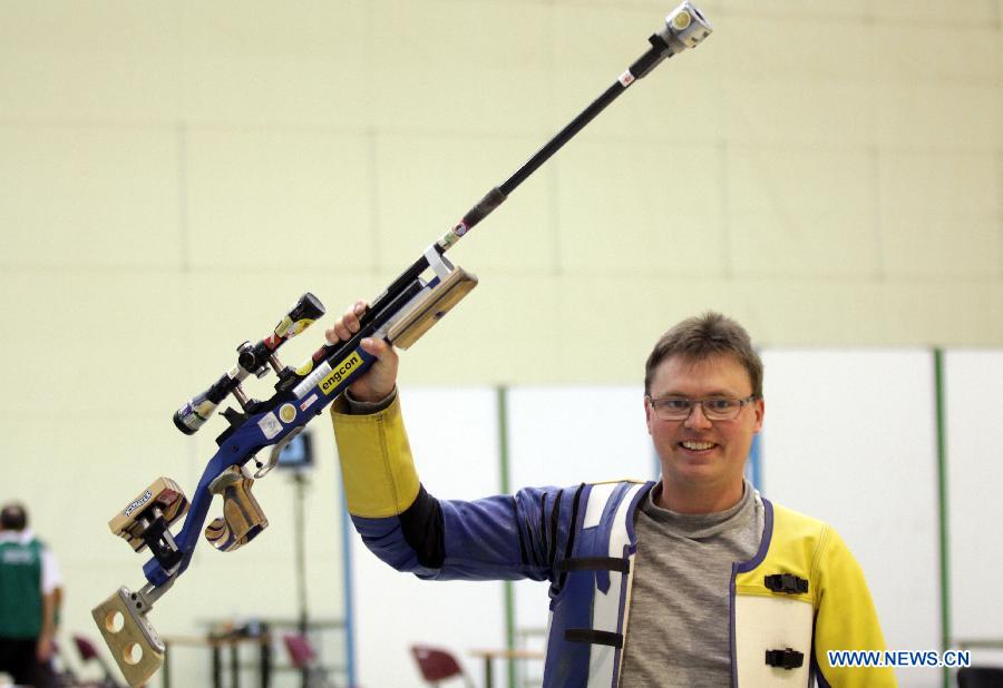 Sweden's Emil Martinsson celebrates after the final of 10m Running Target Men at the 51st World Championship of the ISSF (International Shooting Sport Federation) at Granada, Spain, Sept. 17, 2014. Emil Martinsson won the title of the event. (Xinhua)
