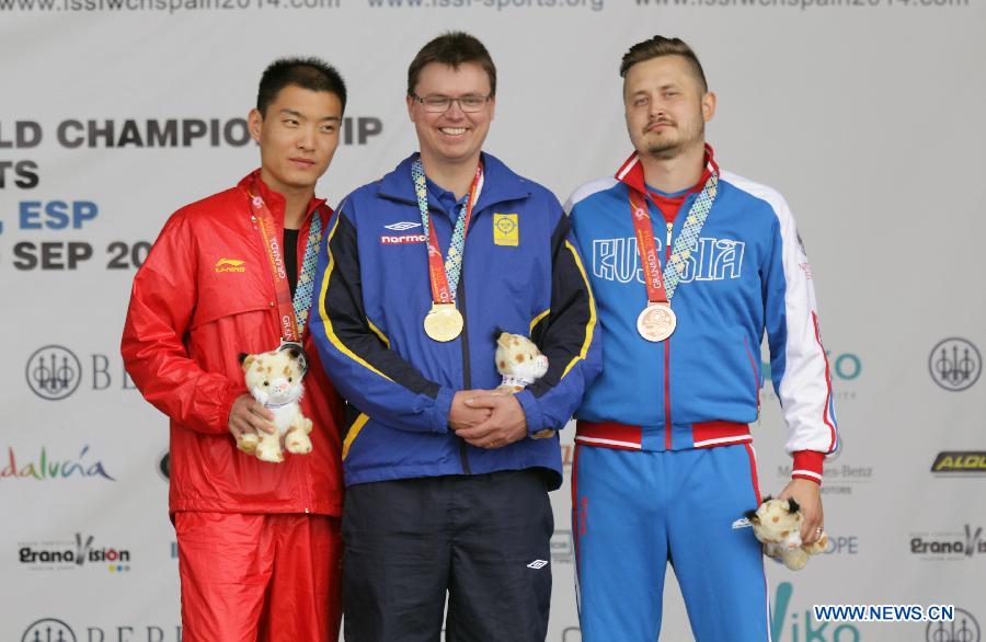 Sweden's Emil Martinsson (C), China's Zhai Yujia (L) and Russia's Dmitry Romanov greet the spectators during the awarding ceremony for 10m Running Target Men at the 51st World Championship of the ISSF (International Shooting Sport Federation) at Granada, Spain, Sept. 17, 2014. Emil Martinsson won the title of the event. (Xinhua) |