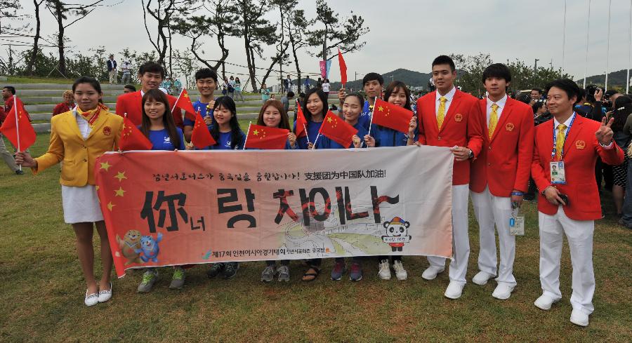 Chinese athletes pose for a group photo with supporters during a flag-raising ceremony at the Athletes' Village in Incheon, South Korea, Sept. 18, 2014. The Chinese delegation to the 17th Asian Games held flag-raising ceremony at the Athletes' Village on Thursday. (Xinhua/Xie Haining) |