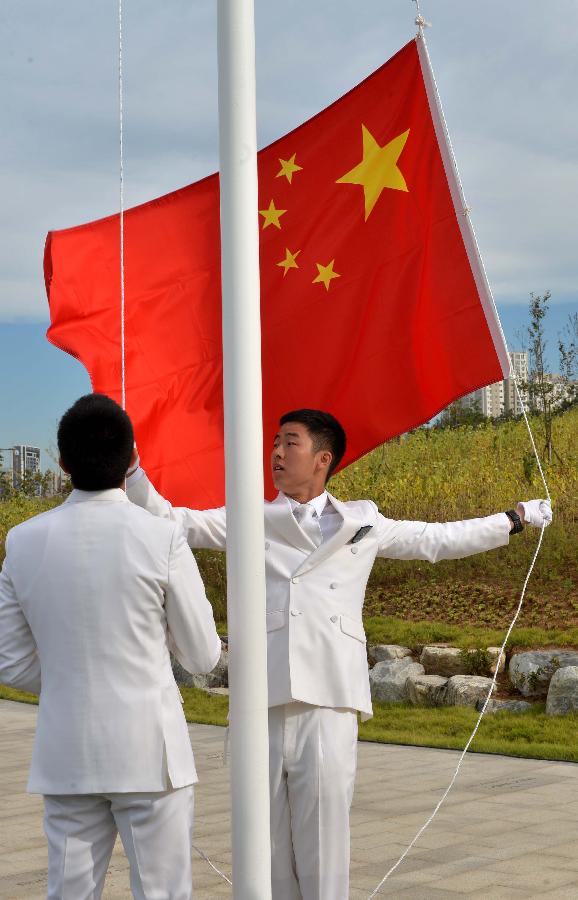Flag raisers prepare during a flag-raising ceremony of Chinese delegation at the Athletes' Village in Incheon, South Korea, Sept. 18, 2014. The Chinese delegation to the 17th Asian Games held flag-raising ceremony at the Athletes' Village on Thursday. (Xinhua/Zhu Zheng) |