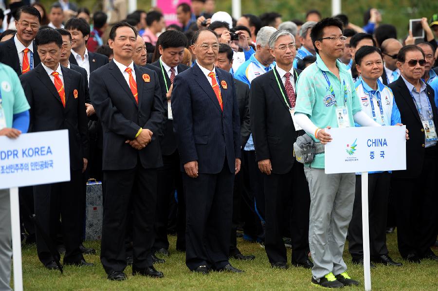 Liu Peng (3rd L, front), chef de mission of Team China, attends a flag-raising ceremony at the Athletes' Village in Incheon, South Korea, Sept. 18, 2014. The Chinese delegation to the 17th Asian Games held flag-raising ceremony at the Athletes' Village on Thursday. (Xinhua/Han Yuqing) |