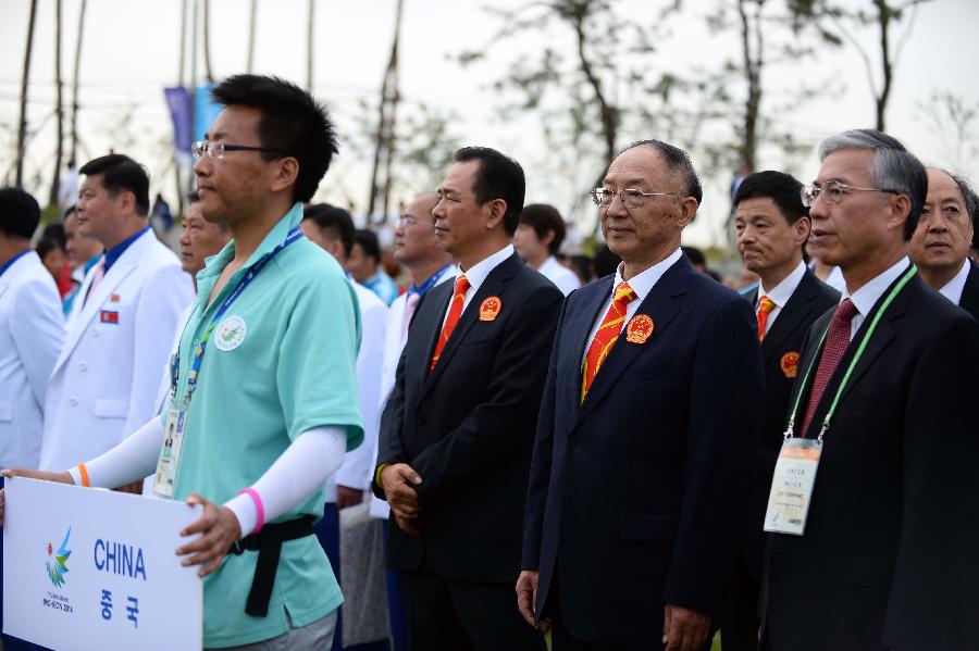 Officials of Chinese delegation attend a flag-raising ceremony at the Athletes' Village in Incheon, South Korea, Sept. 18, 2014. The Chinese delegation to the 17th Asian Games held flag-raising ceremony at the Athletes' Village on Thursday. (Xinhua/Zhu Zheng)