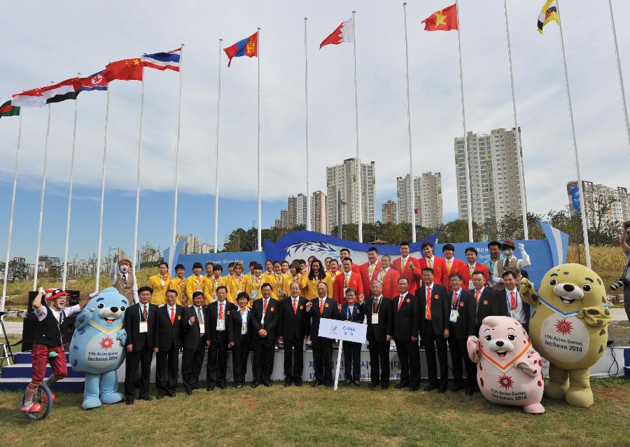 Members of the Chinese delegation to the 17th Asian Games pose for a group photo during a flag-raising ceremony at the Athletes' Village in Incheon, South Korea, Sept. 18, 2014. The Chinese delegation to the 17th Asian Games held flag-raising ceremony at the Athletes' Village on Thursday. (Xinhua/Xie Haining) |