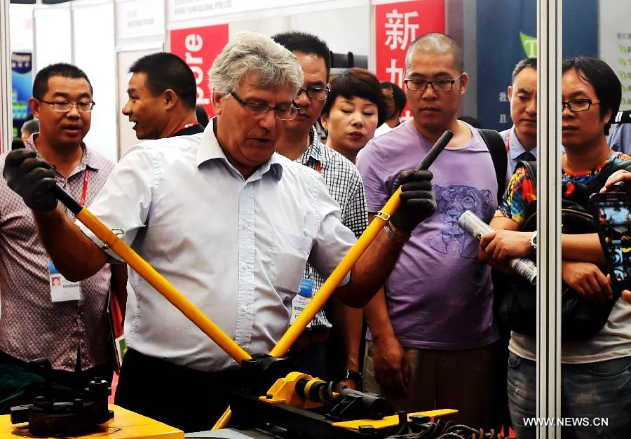 An Austrian engineer demonstrates ironwork making at the 11th China-ASEAN Expo (CAEXPO) in Nanning, capital of south China's Guangxi Zhuang Autonomous Region, Sept. 18, 2014. The annual CAEXPO attracted worldwide visitors and businessmen who searched for markets and business opportunities. (Xinhua/Zhang Ailin) |