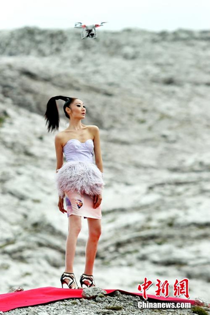 Super models from a Chinese reality show wearing 12cm high heels walk on the 50-meter red carpet on Dolomiti Di Brenta, the Alps in Italy on Sept. 10, 2014. (CNS/GXTV)