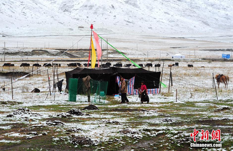 Hongyuan Grassland experiences its first autumn snow this autumn on Sept.16, 2014. Hongyuan Grassland (literally red prairie or red plain), located in the middle of the Aba Tibetan and Qiang Autonomous Prefecture at the north of Sichuan, is known as "Gold Sands and Silver Sands" of plateau for its unique natural landscape and abundant natural resources. (Chinanews.com/Xie Hongcheng) |