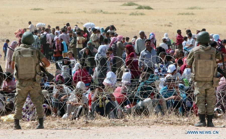 Turkish army block Syrians from crossing into Turkey in the province of Sanliurfa, near the Turkish-Syrian border on Turkey's side, Sept. 18, 2014. Thousands of Syrians crowded around the border line on Sept. 18 after that Jihadists from the Islamic State have seized a string of villages in northern Syria. (Xinhua/Mert Macit) |
