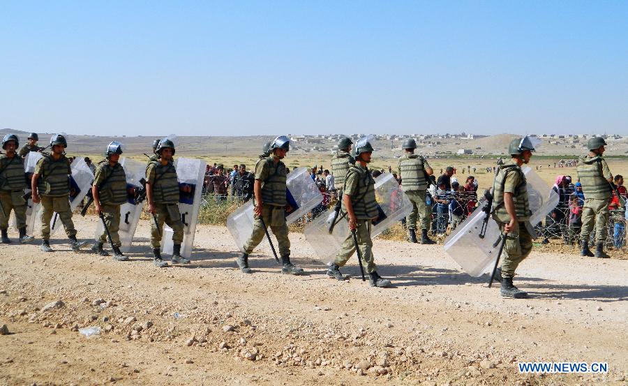 Turkish army block Syrians from crossing into Turkey in the province of Sanliurfa, near the Turkish-Syrian border on Turkey's side, Sept. 18, 2014. Thousands of Syrians crowded around the border line on Sept. 18 after that Jihadists from the Islamic State have seized a string of villages in northern Syria. (Xinhua/Mert Macit) |