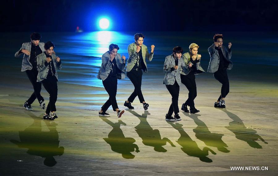 South Korean pop group EXO performs before the opening ceremony of the 17th Asian Games at the Incheon Asiad Main Stadium in Incheon, South Korea, Sept. 19, 2014. (Xinhua/Lin Yiguang)