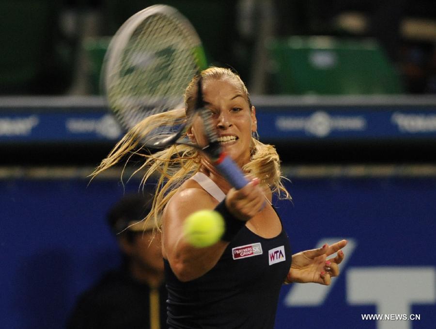 Dominika Cibulkova of Slovakia hits a return to Angelique Kerber of Germany during the third round match at the Toray Pan Pacific Open tournament in Tokyo, Japan, Sept. 19, 2014. (Xinhua/Stringer)