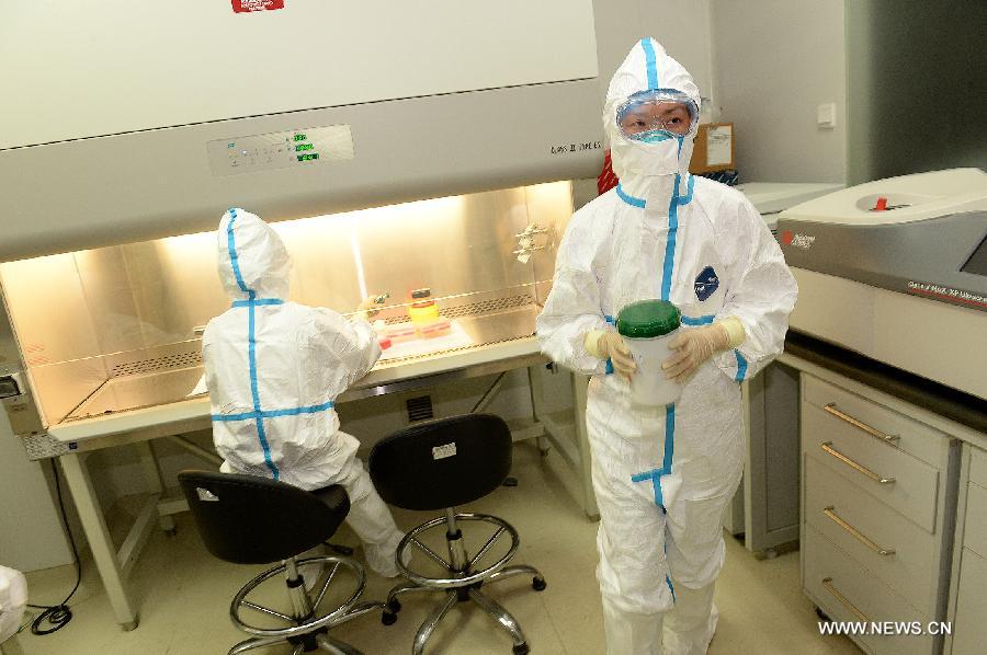 Researchers work in Chinese Center for Disease Control and Prevention (CDC) in Beijing, capital of China, Sept. 19, 2014. Chinese Center for Disease Control and Prevention announced on Friday that a diagnostic kit for ebolavirus was successfully developed and it would be soon applied in Sierra Leone. (Xinhua/He Junchang) |