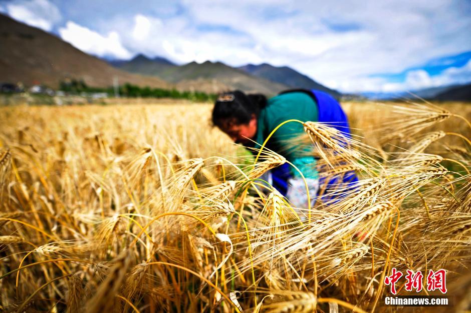 Highland barley harvest has begun in Tibet. In Lhasa and Shigatse, farmers are busy harvesting the highland barley in lands covered with golden ears of barley. (Chinanews.com/Tang Zhaoyang)