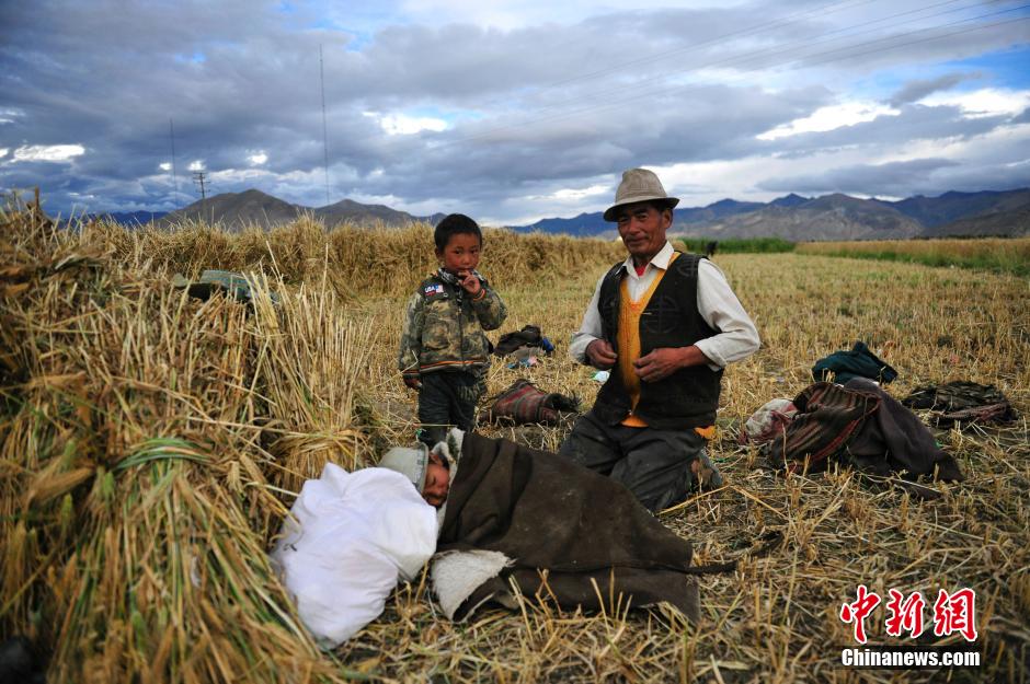 Highland barley harvest has begun in Tibet. In Lhasa and Shigatse, farmers are busy harvesting the highland barley in lands covered with golden ears of barley. (Chinanews.com/Tang Zhaoyang)