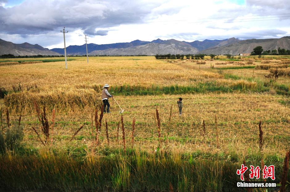 Highland barley harvest has begun in Tibet. In Lhasa and Shigatse, farmers are busy harvesting the highland barley in lands covered with golden ears of barley. (Chinanews.com/Tang Zhaoyang)