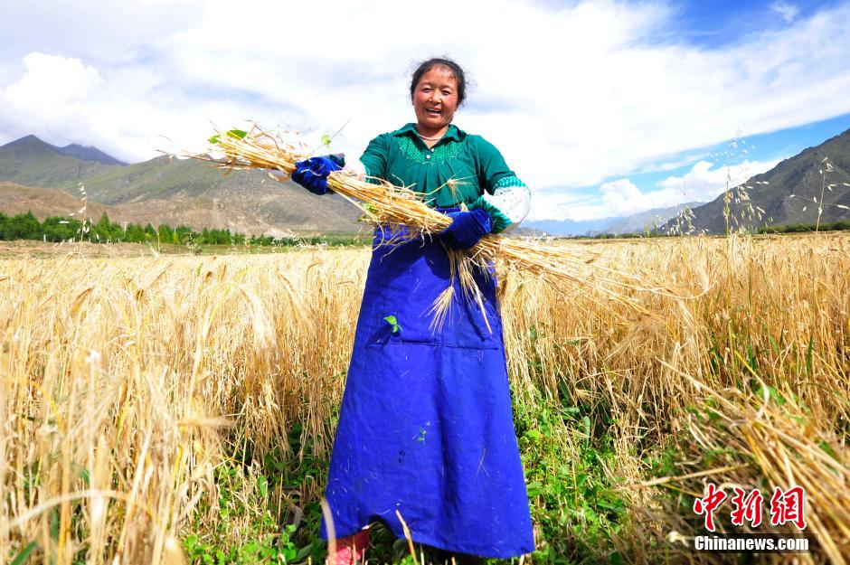 Highland barley harvest has begun in Tibet. In Lhasa and Shigatse, farmers are busy harvesting the highland barley in lands covered with golden ears of barley. (Chinanews.com/Tang Zhaoyang)