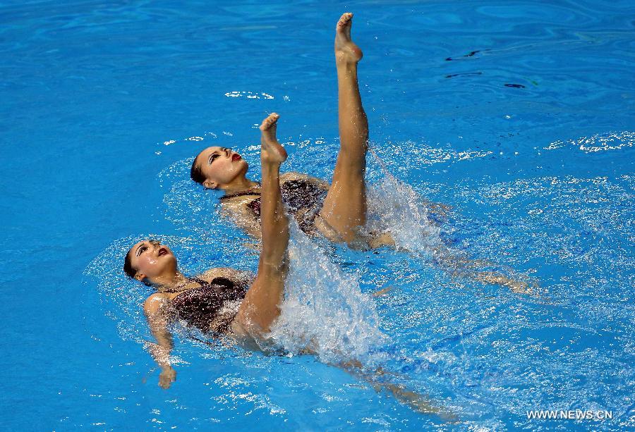 Huang Xuechen (upper) and Sun Wenyan of China perform during the duet technical routine of synchronised swimming competition at the 17th Asian Games in Incheon, South Korea, Sept. 20, 2014. (Xinhua/Meng Yongmin)