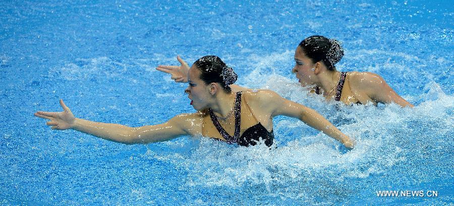 Huang Xuechen (L) and Sun Wenyan of China perform during the duet technical routine of synchronised swimming competition at the 17th Asian Games in Incheon, South Korea, Sept. 20, 2014. (Xinhua/Wang Peng)