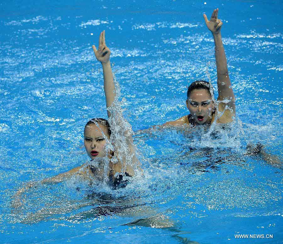 Huang Xuechen (L) and Sun Wenyan of China perform during the duet technical routine of synchronised swimming competition at the 17th Asian Games in Incheon, South Korea, Sept. 20, 2014. (Xinhua/Wang Peng)