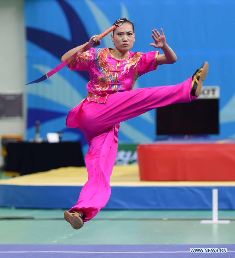Wei Hong of China performs during the women's nandao of Wushu competition at the 17th Asian Games in Incheon, South Korea, Sept. 20, 2014. (Xinhua/Xie Haining)