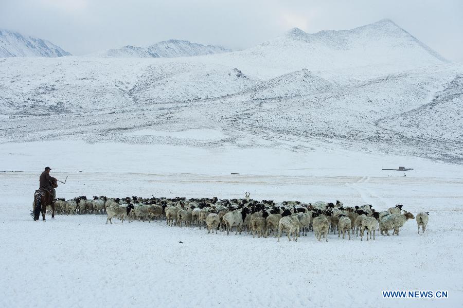 A shepherd herds sheep to find food in Hejing County of Mongolian Autonomous Prefecture of Bayingolin, northwest China's Xinjiang Uygur Autonomous Region, Sept. 20, 2014. A cold front hit here on Saturday, bringing snow and plunging the temperature. (Xinhua/Jiang Wenyao) |
