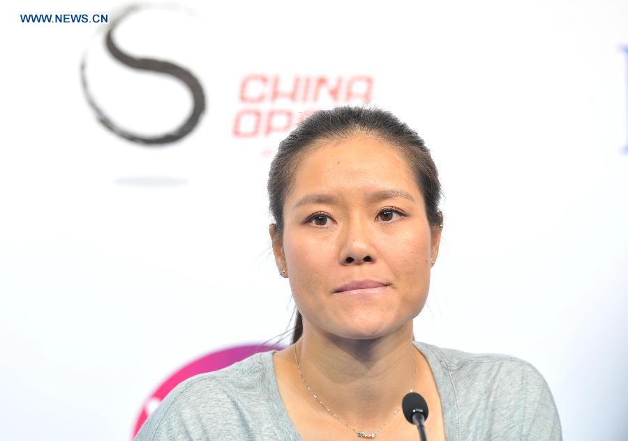 Chinese famous tennis player Li Na reacts during her retirement press conference in Beijing, capital of China, Sept. 21, 2014. China's first and only Grand Slam winner Li Na formally announced her retirement on Sept. 19, leaving Chinese tennis yearning for the next superstar. (Xinhua/Li Wen)