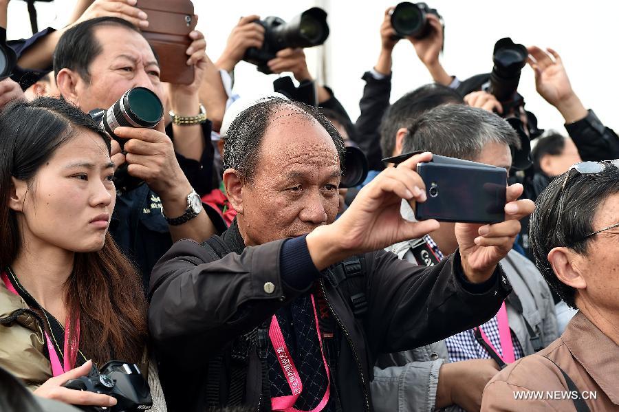 A tourist takes pictures of the opening ceremony of Pingyao International Photography Festival with a mobile phone in Pingyao County, north China's Shanxi Province, Sept. 19, 2014. With the popularization of mobile phone cameras, mobile phone photography plays an important role in daily life. (Xinhua/Zhan Yan) |