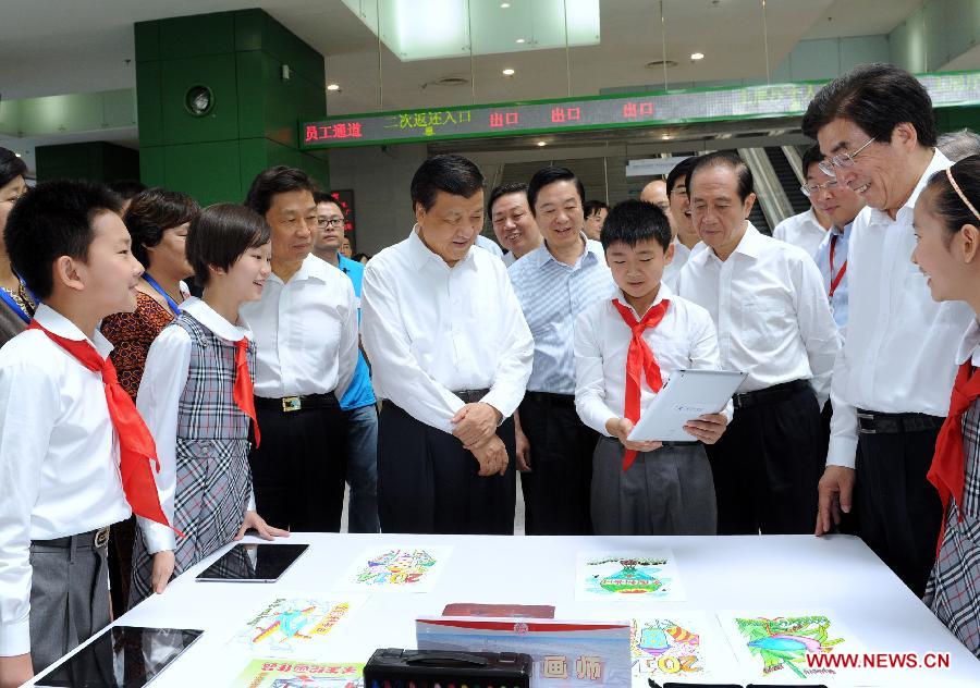 Liu Yunshan (C), a member of the Standing Committee of the Political Bureau of the Communist Party of China (CPC) Central Committee and secretary of the CPC Central Committee's Secretariat, attends an activity marking China's 11th National Science Popularization Day at the China Science and Technology Museum in Beijing, capital of China, Sept. 20, 2014. (Xinhua/Rao Aimin) |