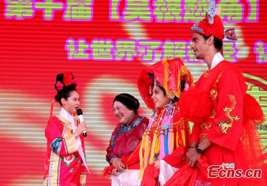 A traditional Chinese wedding ceremony for 20 foreign couples is held in Fengjing, an ancient water town of Shanghai on Sunday, September 21, 2014. Couples from 14 countries including India, Singapore, Afghanistan, Spain, and Poland tied the knot and experienced local ethnic customs at the event. |
